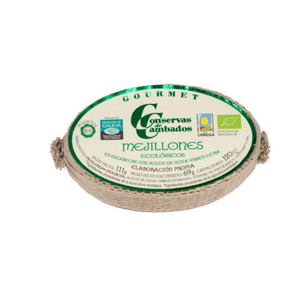 Mejillones de Conservas Cambados, originarios de las Rías Gallegas y certificados como ecológicos, presentados en escabeche con aceite de oliva orgánico. De tamaño seleccionado y fritura en aceite de oliva, estos mejillones se ofrecen con un escabeche clásico.